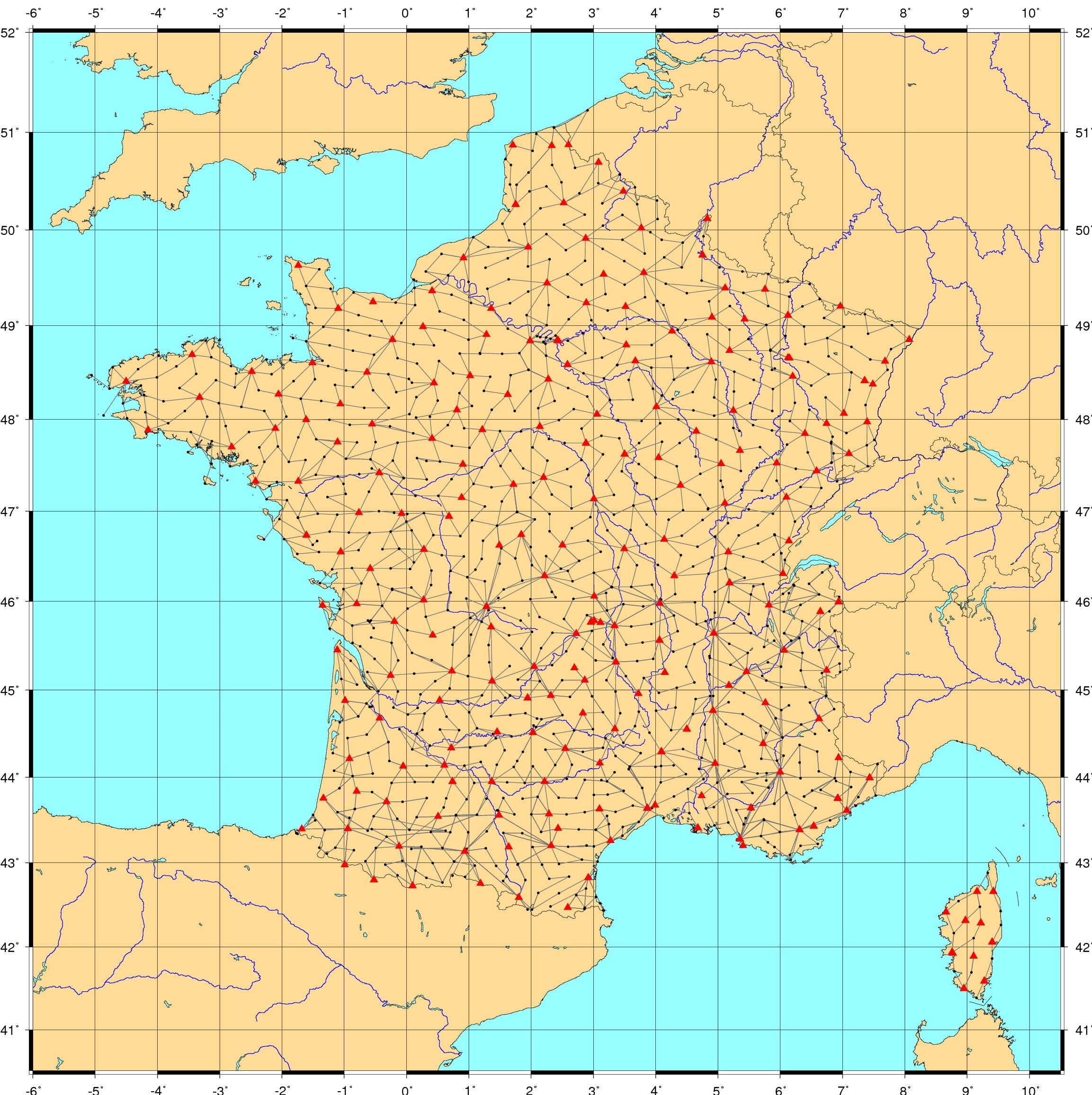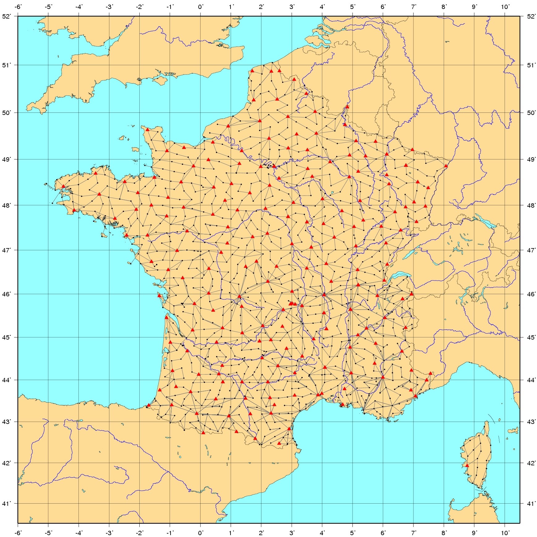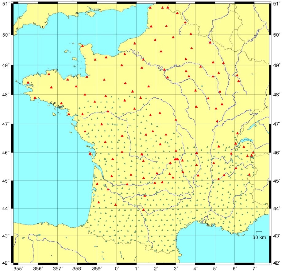 En 2004, l'IGN a a étendu le réseau dans le centre et l'est de la France. Les triangles rouges représentent les points de premier ordre, prévus pour être observés avec un gravimètre absolu dont l'IGN prévoyait la mise en service en 2025.
