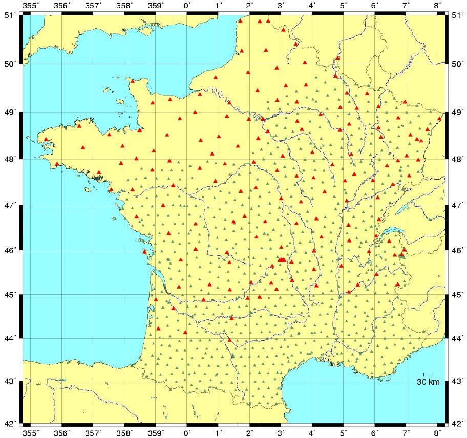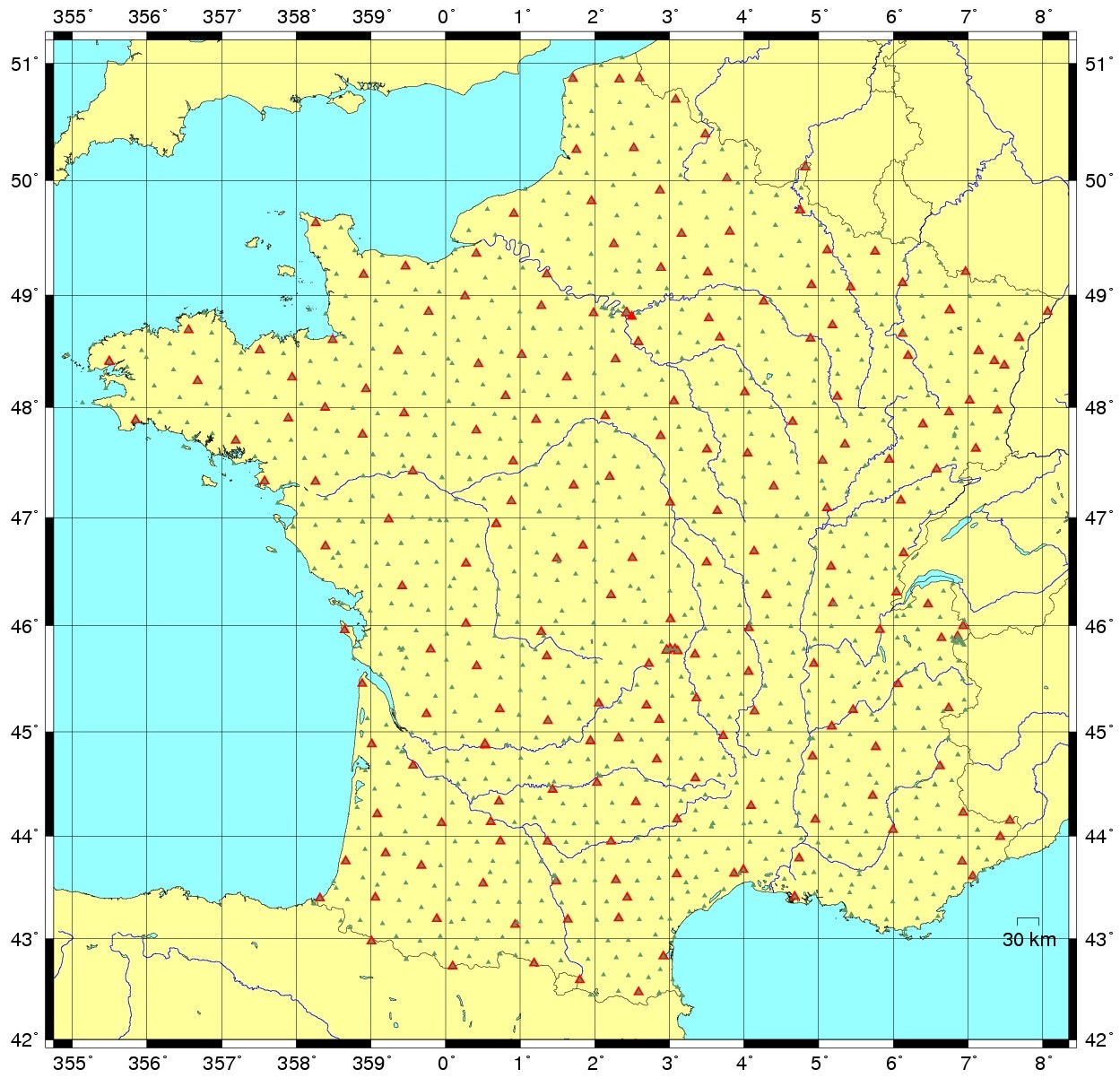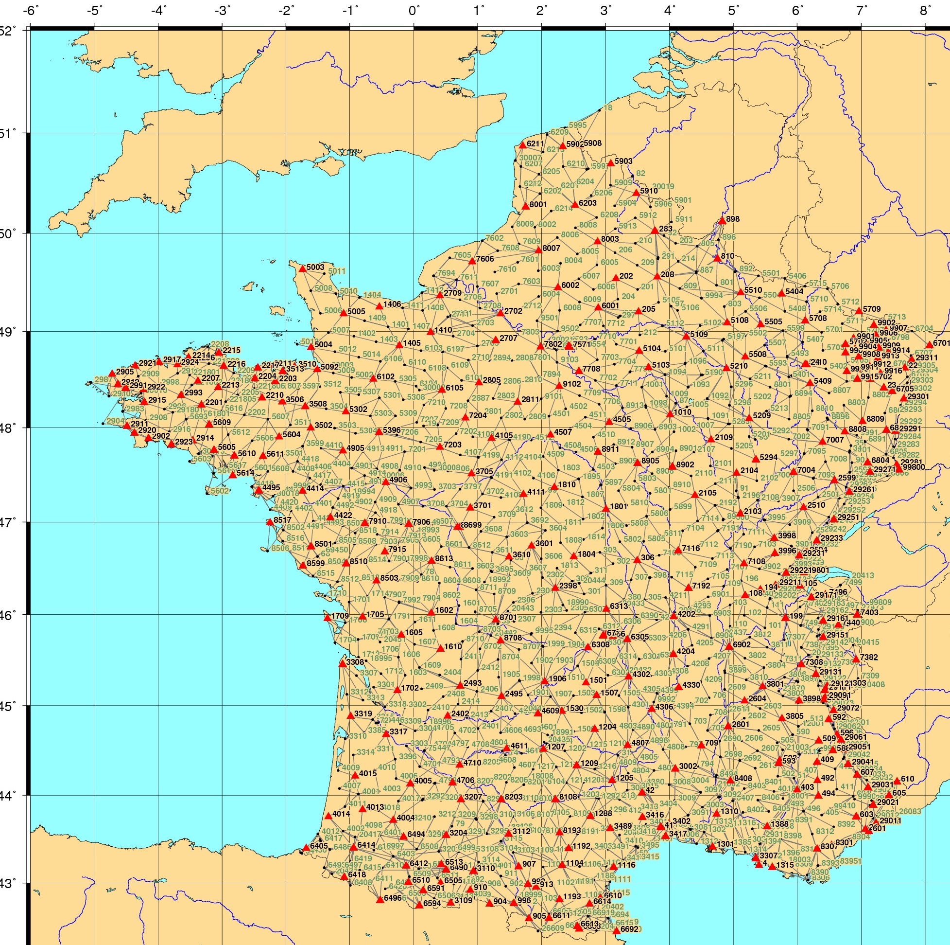 En 2004, l'IGN a a étendu le réseau dans le centre et l'est de la France. Les triangles rouges représentent les points de premier ordre, prévus pour être observés avec un gravimètre absolu dont l'IGN prévoyait la mise en service en 2025.